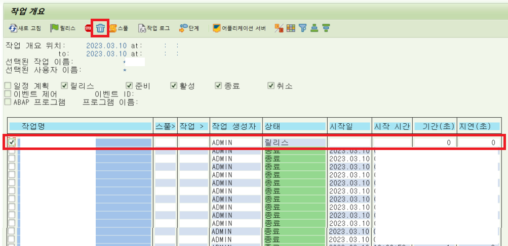 릴리즈 상태의 BATCH JOB을 체크 후 쓰레기통 버튼을 누를 시, 해당 BATCH JOB이 더 이상 돌지 않게 된다.